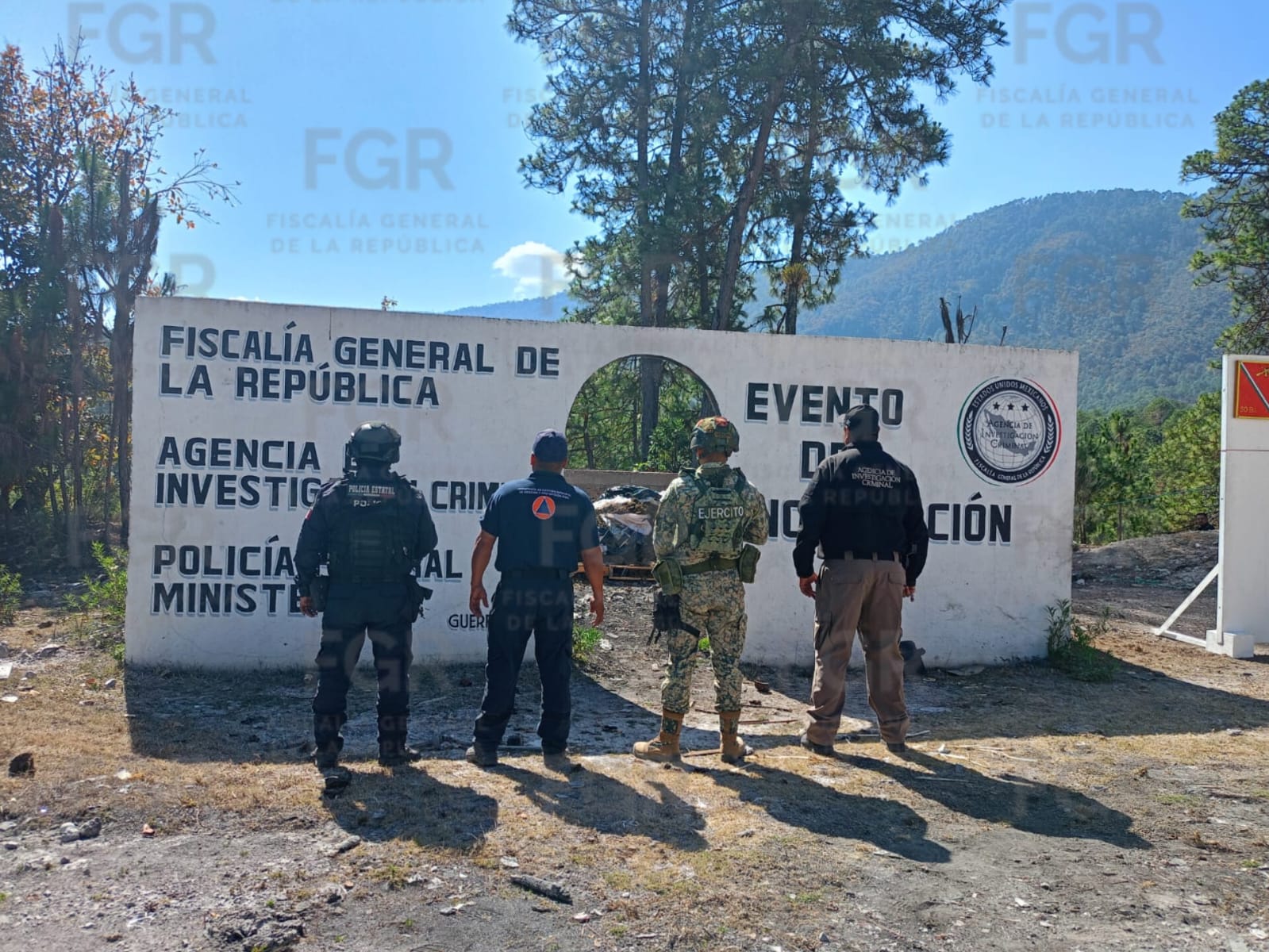 Se contó con el apoyo de elementos de la Policía Federal Ministerial (PFM), Policía Estatal, de la Secretaría de Gestión Integral de Riesgos y Protección Civil, así como peritos en materia de Química y Fotografía Forense de la FGR, todo en coordinación con personal de la Secretaría de la Defensa Nacional (Defensa).